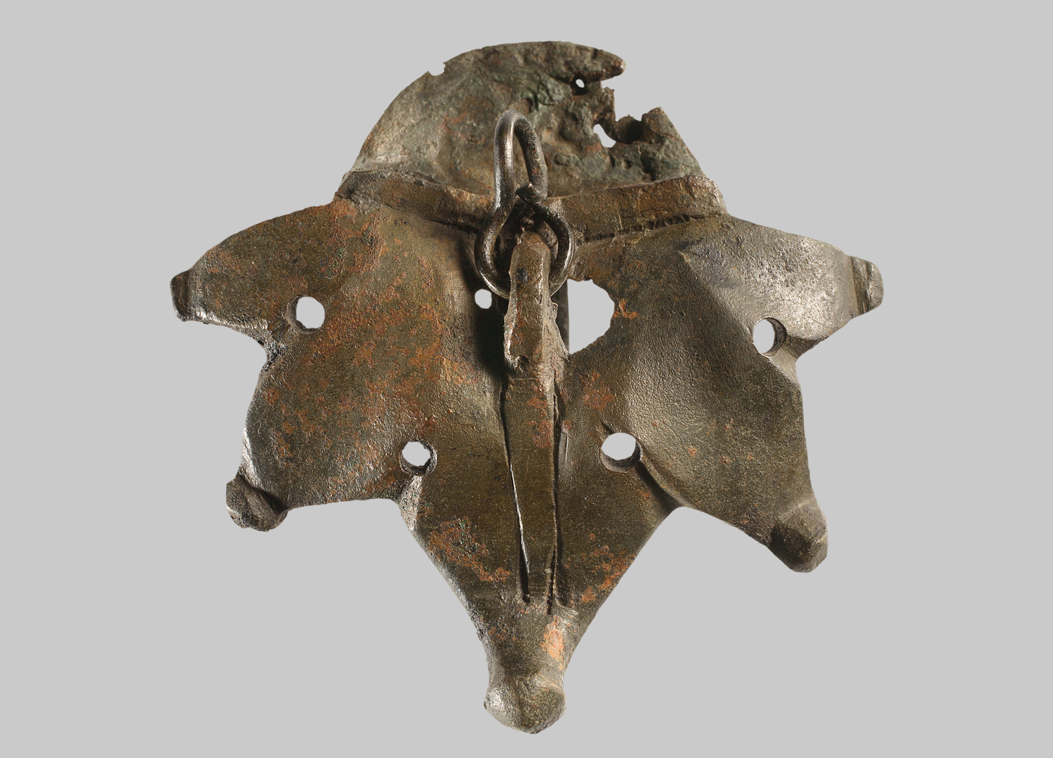 Die Attasche in Form eines Weinblattes ist mehrfach durchlocht. An der Vorderseite befindet sich eine Öse, an der ein achterförmiges Kettenglied befestigt ist.