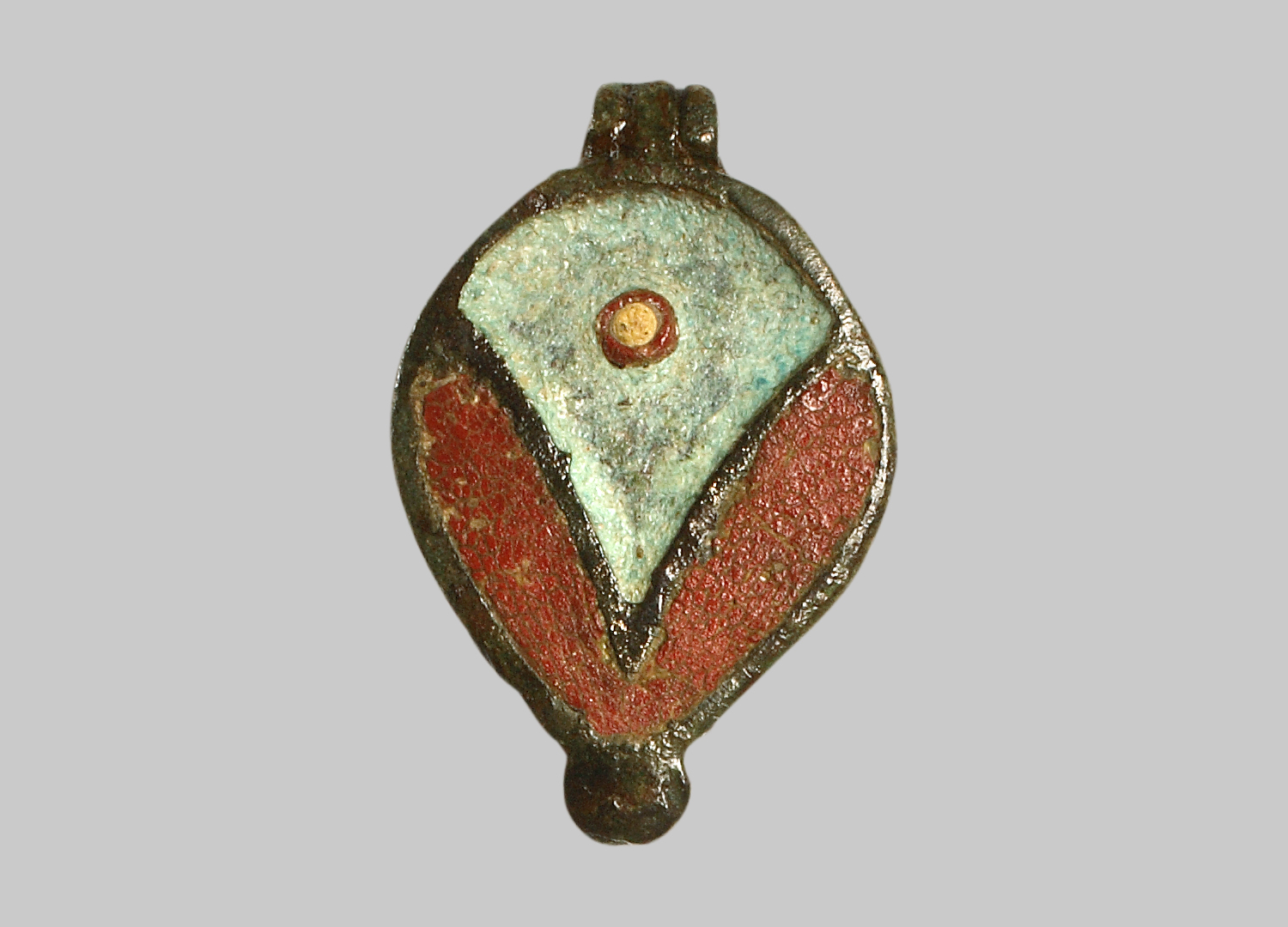Blattförmig. Auf Deckeloberseite geometrisches Muster in Emaileinlegearbeit (rot, weiß?, gelb).