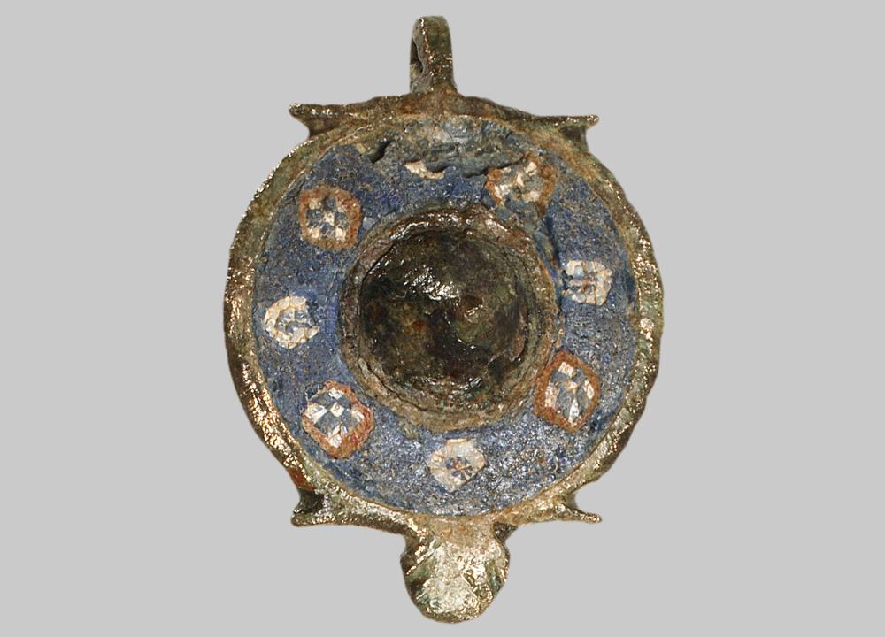 Rund. Auf Deckeloberseite zwei kreisrunde Vertiefungen. Emaileinlegearbeit (blau, rot, weiß) nur im äußeren Kreis. Innerer Kreis kegelförmig aufgewölbt.