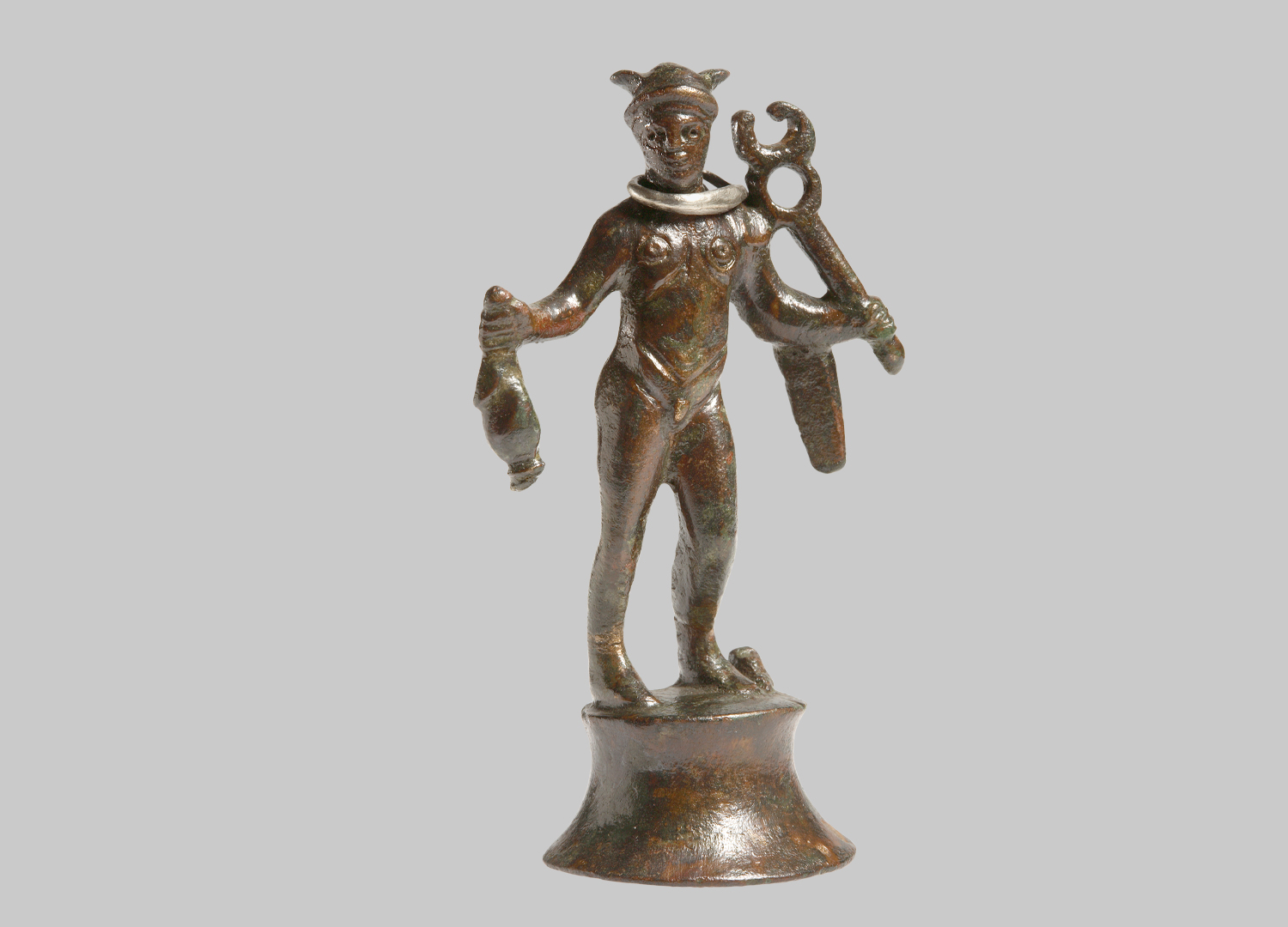 Merkur, nackt, auf dem rechten Bein stehend, das linke abgewinkelt und leicht zurückgesetzt. Er hat die Chlamys umgelegt, die von einem Bausch auf der linken Schulter über den Unterarm geschlungen bis in Kniehöhe herabhängt. In der vom Körper weggestreckten abgewinkelten Rechten hält er den Geldbeutel, mit der gesenkten abgewinkelten Linken umfasst er den geflügelten Heroldstab. Auf dem leicht nach rechts geneigtem Kopf sitzt der Flügelhut. Um den Hals ist ein silberner Torques gelegt. Die Brustmuskulatur ist sehr grob angegeben, die durch Punkte angedeuteten Brustwarzen sind von einem Kreis umgeben. Der Gott steht auf einem runden Postament mit eingezogenen Seiten.