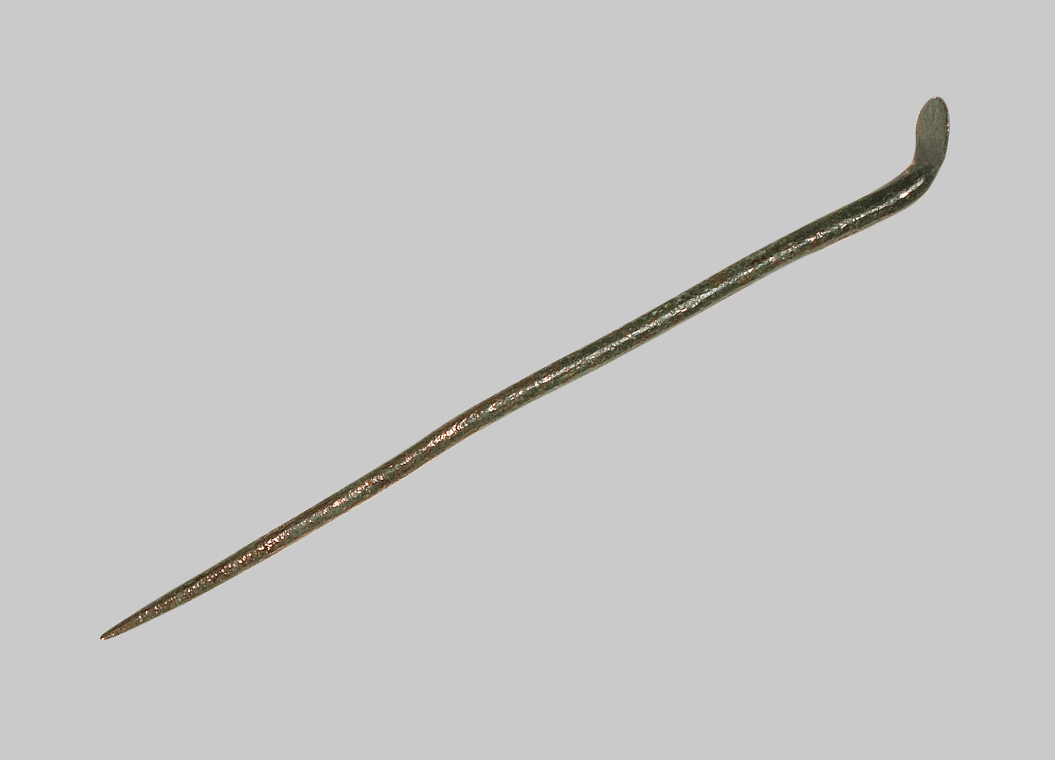 Unverzierter glatter Stiel. Spitzes Ende. Flache, geknickte Laffe.