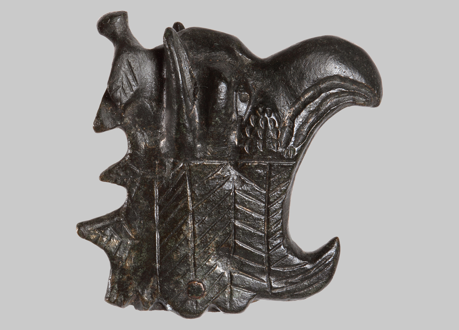 Der Griff ist in Form eines Greifenkopfes gestaltet. Das Federkleid ist durch Strichdekor angedeutet. Das obere Ende des gezackten Kamms geht in eine stilisierte Vogeldarstellung über. Der gewellte untere Abschluss des Griffs endet vorne mit einem aufgebogenem Fortsatz. Die mit einer Niete befestigte Klinge ist im geschlitzen unteren Teil des Griffes noch im Ansatz erhalten.