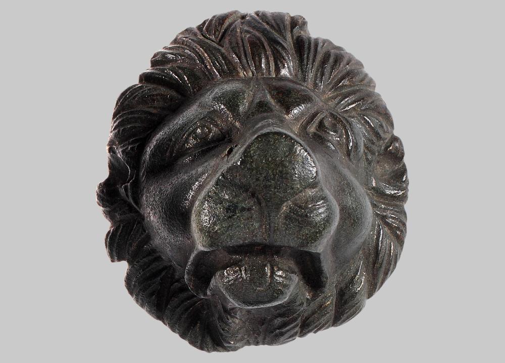 Plastisch gestaltete Löwenkopfapplik. Das Gesicht wird von der gesträhnten Mähne gerahmt. Die Pupillen der asymmetrischen Augen sind durch Bohrungen angedeutet. Unterhalb der großen Schnauze sind die Lefzen seitlich weit nach hinten gezogen. Auf der Rückseite erkennt man eine mittige Vertiefung für die Aufnahme eines nicht mehr erhaltenen Befestigungsstiftes.