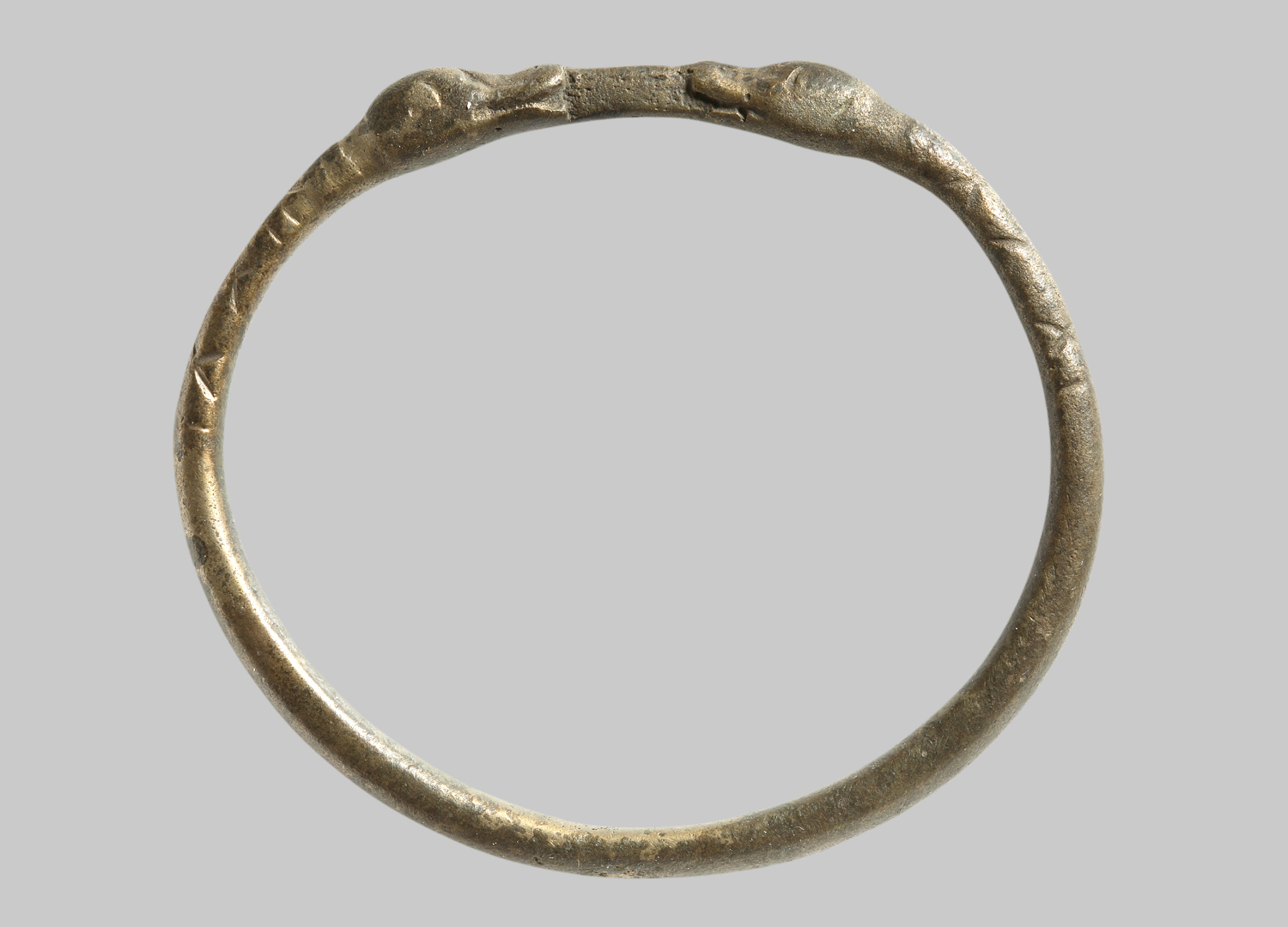 Glatter, geschlossener Reif. An beiden Reifenden ein Vogelkopf (Enten oder Schwäne). Zwischen den Schnäbeln ein langrechteckiger Steg. Im Halsbereich der Vögel Kerbstrichverzierung.