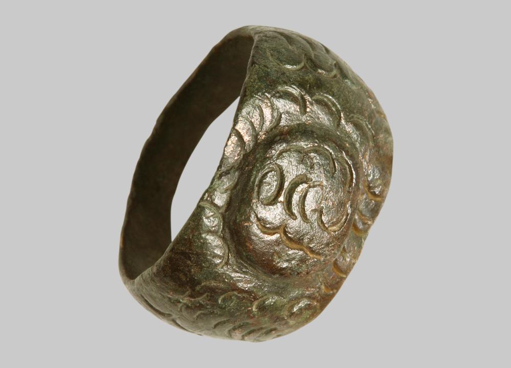 Bandförmiger Reif, der sich nach oben stark verbreitert. Die Schultern sind abgerundet. An der Vorderseite ist eine ovale Schmuckplatte (0,95 x 1,05 cm) angelötet. Schuppenförmiger Dekor an der Platte und den Schultern des Ringes.