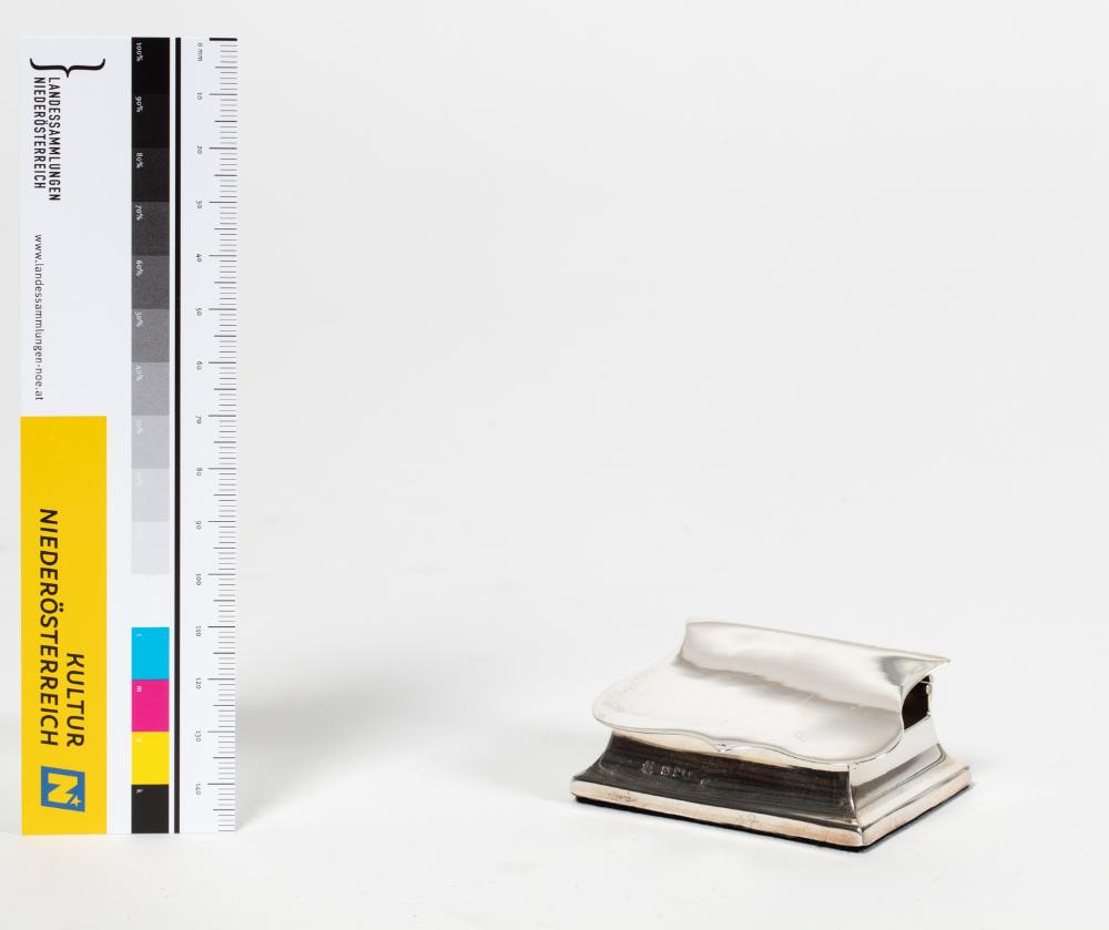eine Halterung mit geferderter Spange, vermutlich für Streichholzschachteln, Sockel mit konkaver Wandung und schwarzem Filz an der Standfläche sowie schildförmig geschweifter Spange