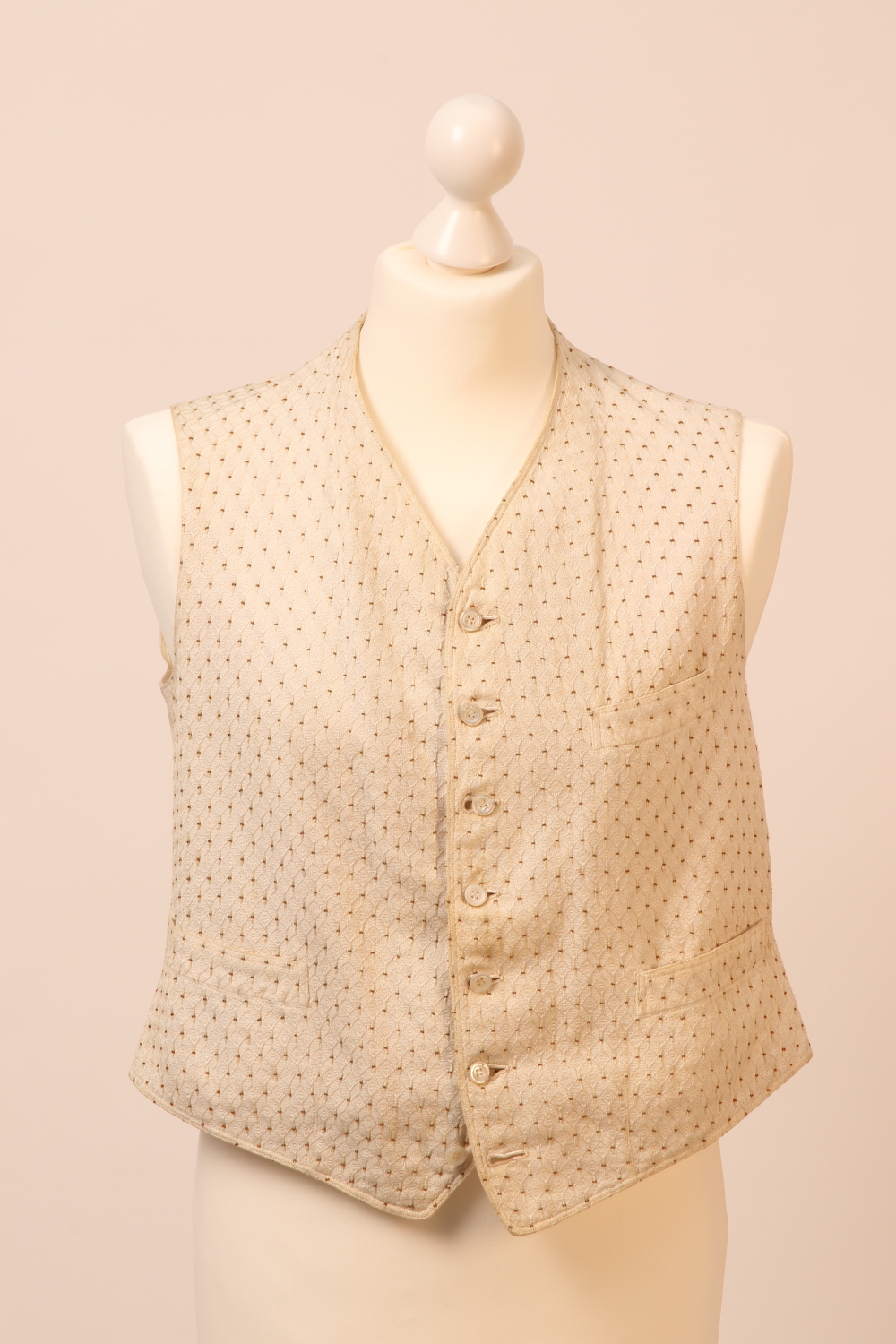 Weiße Weste mit Rautenmuster und braunen Punkten, Perlmuttknöpfe und drei Leistentaschen, Rücken und Futter aus Leinen.
