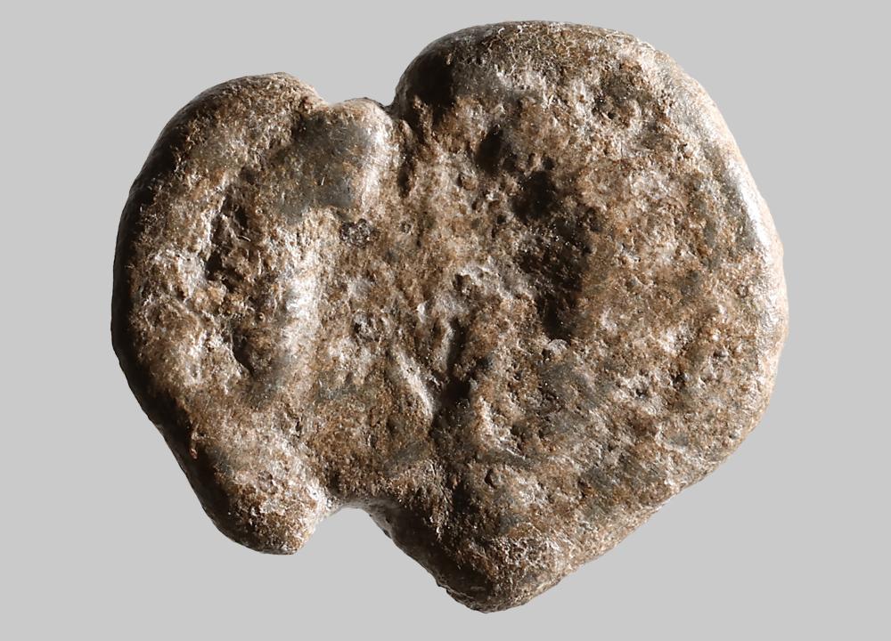 Unförmige Plombe mit rundem Stempel, figurales Motiv nicht mehr erkennbar; senkrechte Durchlochung