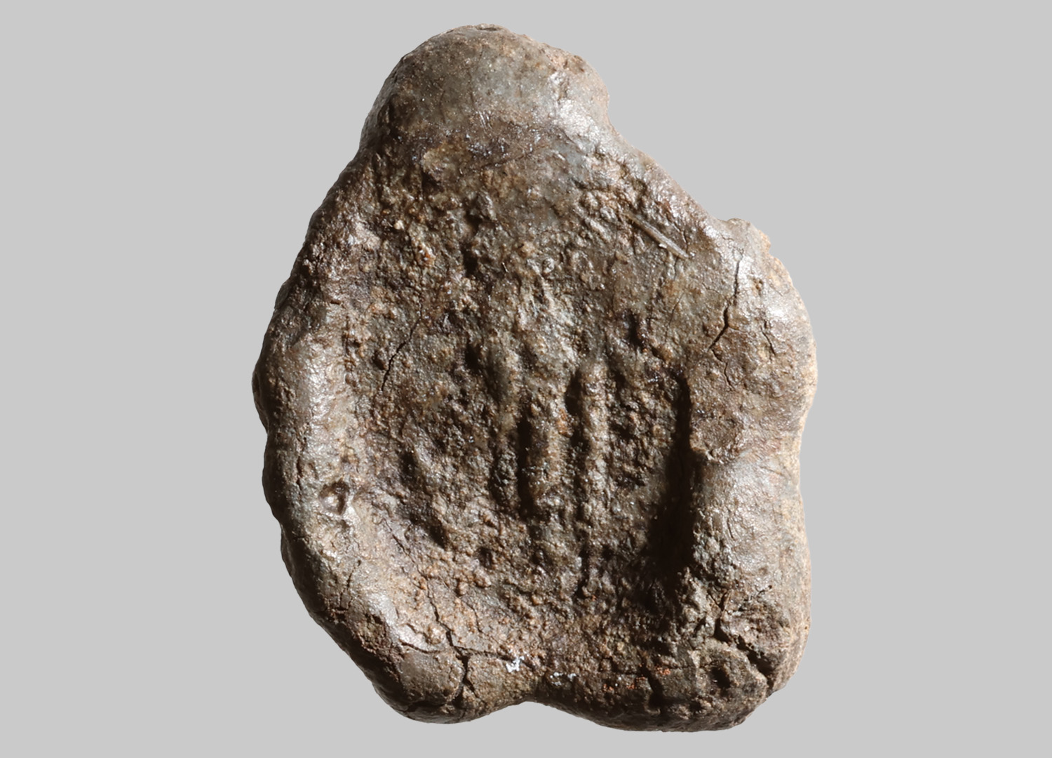 Unförmige Plombe mit ovalem Stempel; figürliches Motiv erkennbar, im unteren Bereich vermutlich Beine und eine Lanzenendung; senkrechte Durchlochung mit vier dünnen Schnurführungen