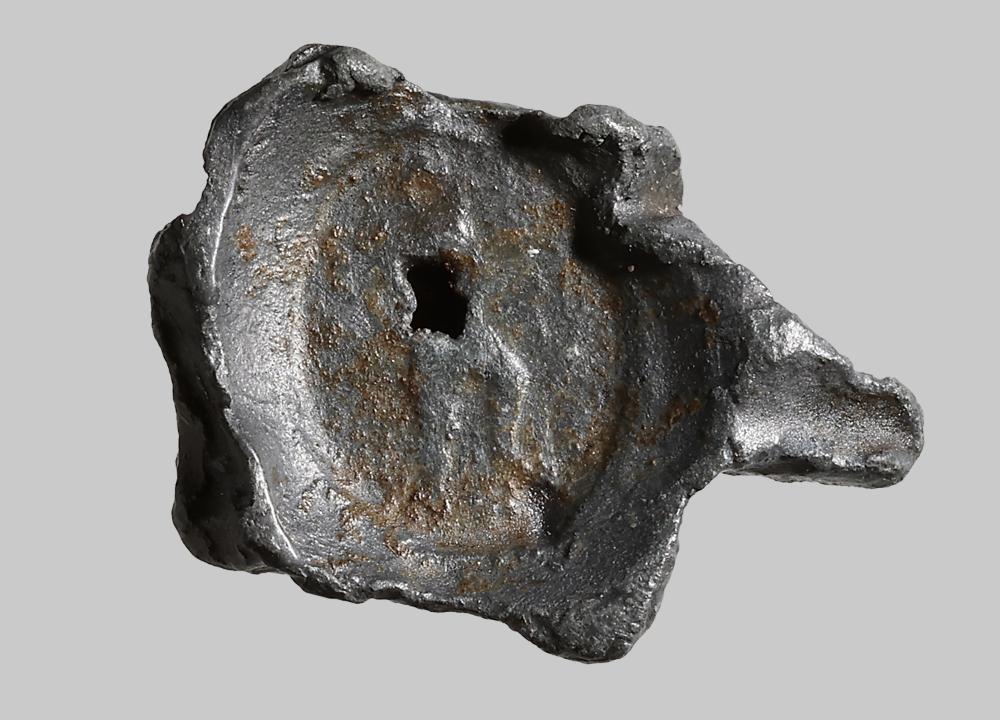 Rechteckige Plombe mit ovalem Stempel und langem Gussfortsatz auf der rechten Seite; Amor leicht Richtung Osten gewendet, Beine leicht angewinkelt, links Flügel kaum erkennbar, rechts vor sich einen großen Bogen haltend; in der Mitte der Bildfläche Fehlstelle; waagrechte Durchlochung; Rückseite trapezförmig