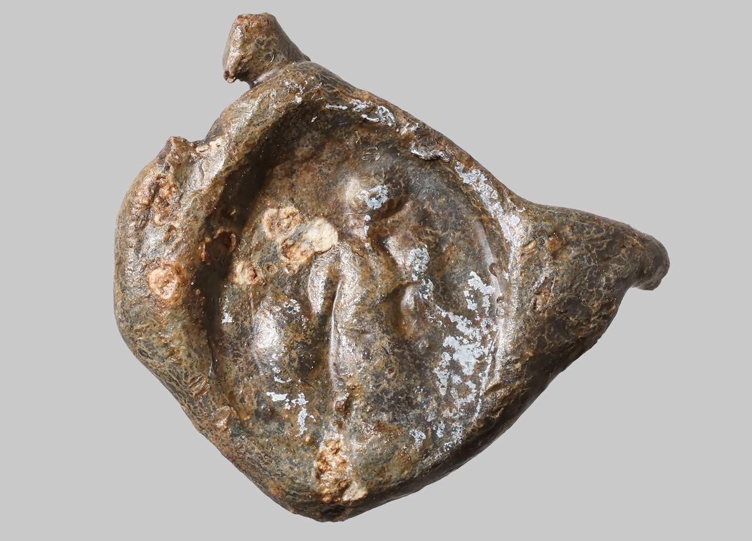 Unförmige Plombe mit Gussfortsätzen oben und seitlich rechts sowie einem ovalen Stempel; Victoria im langen Gewand, stilisiert dargestellt, in 3/4 Ansicht nach links, rechts nach außen geschwungener Flügel, Arme leicht angewinkelt und vor sich ein rundes Schild haltend; unten auf einem Globus stehend; kreuzförmige Durchlochung, größere waagrechte Durchlochung und eine hauchdünne senkrechte Durchlochung