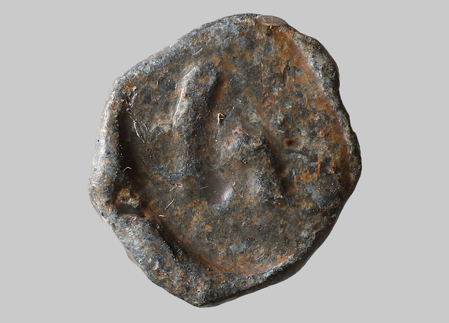 Rundliche Plombe mit ovalem Stempel; Motiv teilweise geprägt, nicht bestimmbar; senkrechte Durchlochung