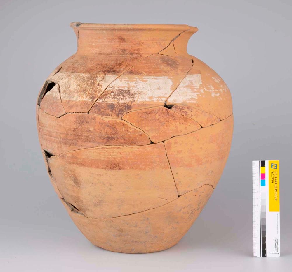 Das große, feinkeramische Gefäß zeichnet sich durch eine Streifenbemalung und geometrisches Übermuster aus. Der Ton ist orange, die Oberfläche ist mit einer dünn aufgetragenen Bemalung versehen.