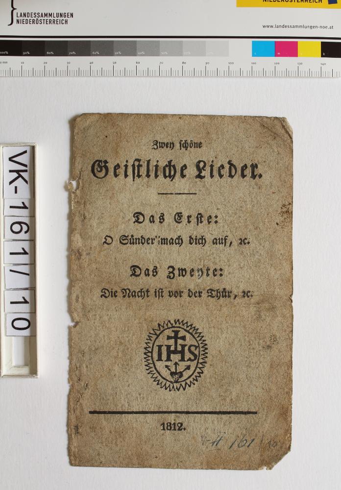 Lieder zu Jesus; 2 Blatt, gefaltet; 1 Blatt lose, ursprünglich geheftet: "Zwey schöne Geistliche Lieder. Das Erste: O Sünder mach dich auf, ec./ Das Zweyte: Die Nacht ist vor der Thür, ec", "1812", Abbildung: Monogramm Jesu; Eintrag Inventarbuch: "Lieder zu Jesus etc. (in einem Umschlag"