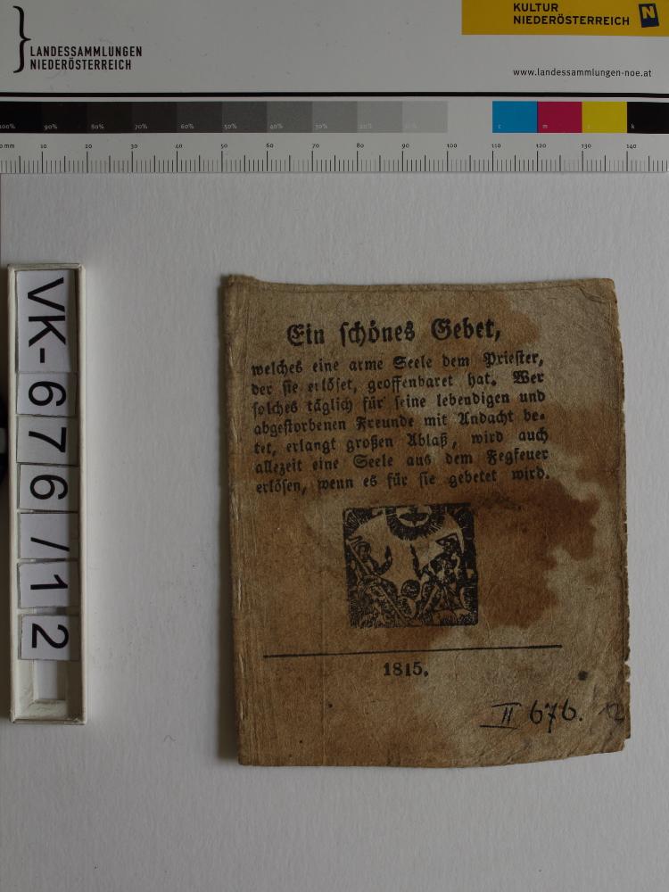 Armenseelengebete; 2 Blatt, gefaltet, geheftet, beschnitten: "Ein schönes Gebet welches eine arme Seele dem Priester, der sie erlöset, geoffenbaret hat", "Geschichte", "Gebet bei der heiligen Messe zu sprechen", "1815", Abbildung: Gnadenstuhl; Eintrag Inventarbuch: "Armenseelengebete"