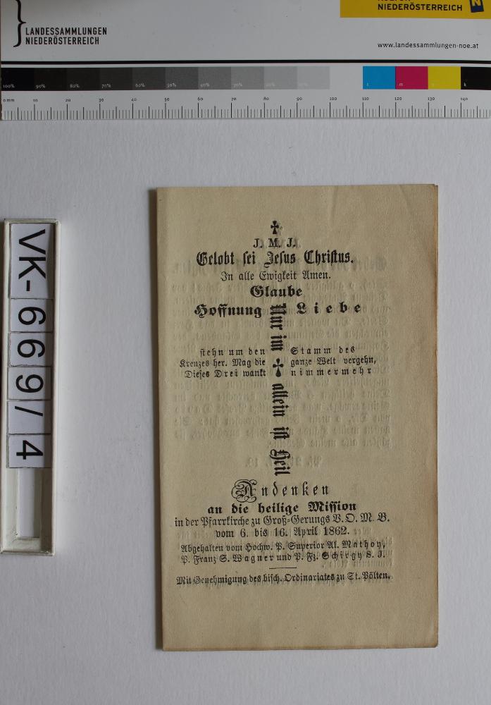 Haupttugenden; 1 Blatt, gefaltet: "Glaube Hoffnung Liebe stehn um den Stamm des Kreuzes her. Mag die ganze Welt vergehn, Dieses Drei wankt nimmer mehr", "Andenken an die heilige Mission in der Pfarrkirche Groß=Gerungs D.O.M.B. vom 6. bis 16. April 1862", "Druck von M. Pammer in Krems"; Eintrag Inventarbuch: "Gebete: 3 Haupttugenden"