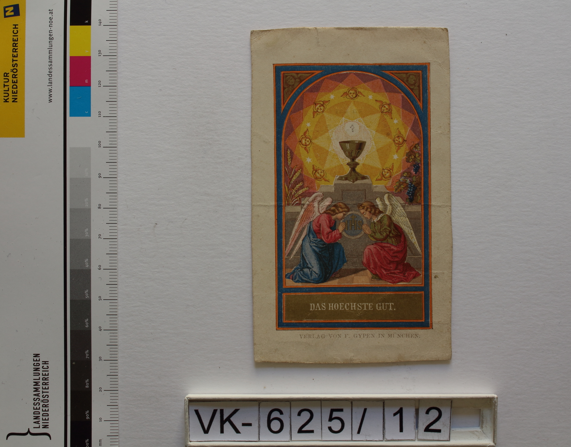 Primiz- und Jubelfeier; Vorderseite: Altar mit Monstranz, Schutzengel, Engelsköpfe (Heiliges Sakrament der Kommunion), "Das höchste Gut", "Verlag von F. Gypen in München"; Rückseite: "Zur Erinnerung an das erste heilige Messopfer, des regul. lateran. Chorherrn Carl Drexler dargebracht am 27. Juli 1884 in der Stiftskirche in Klosterneuburg"; Eintrag Inventarbuch: "Primiz= und Jubelfeiern, Bilder"