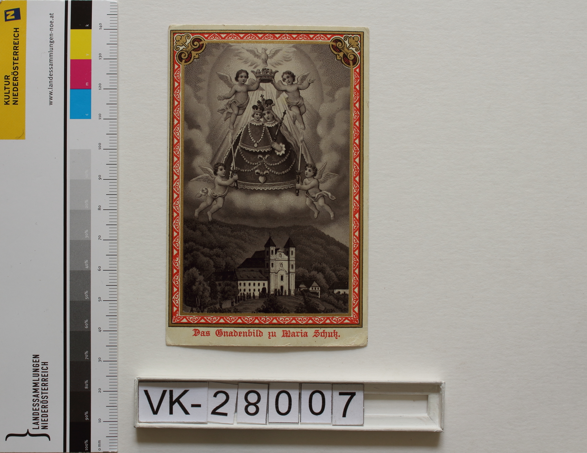 Schottwien, "Maria Schutz" im Semmeringgebiet; Vorderseite: Gnadenbild = Maria mit Kind, Wallfahrtskirche, Heilig-Geist-Taube, Engel, "Das Gnadenbild zu Maria Schutz"; Rückseite: Gebet, handschriftlich "6/8 99", "Verlag von Gregor Fischer Innsbruck"