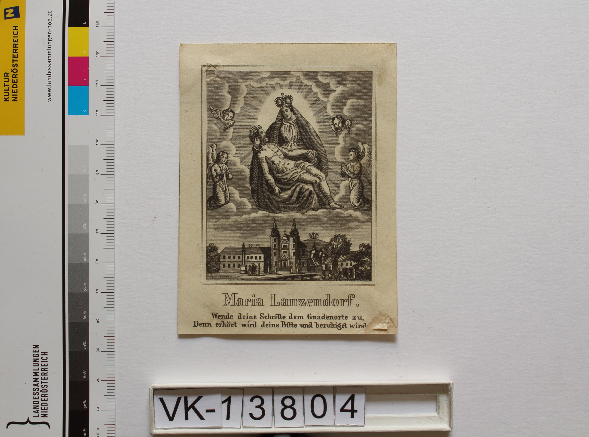 Maria Lanzendorf, "Sieben Schmerzen Mariens"; Vorderseite: Gnadenstatue = Pietà, Wallfahrtskirche, Engel, Engelsköpfe, "Maria Lanzendorf/ Wende deine Schritte dem Gnadenorte zu, denn erhört wird deine Bitte und beruhiget wirst du"; Rückseite: handschriftlich "Spitz a. D./ 29.4.58"; monogrammiert "FW"
