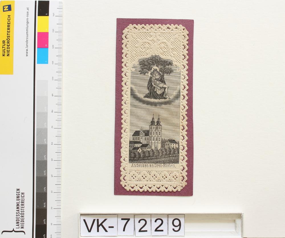 Maria Dreieichen; Vorderseite: Gnadenstatue = Pietà, Basilika, "Andenken an Drei Eichen"; Rückseite: "Gebet", "Franz Schemm, Nürnberg"; verklebt auf Karton; Eintrag Inventarbuch: "Stich, Slg. Klar."