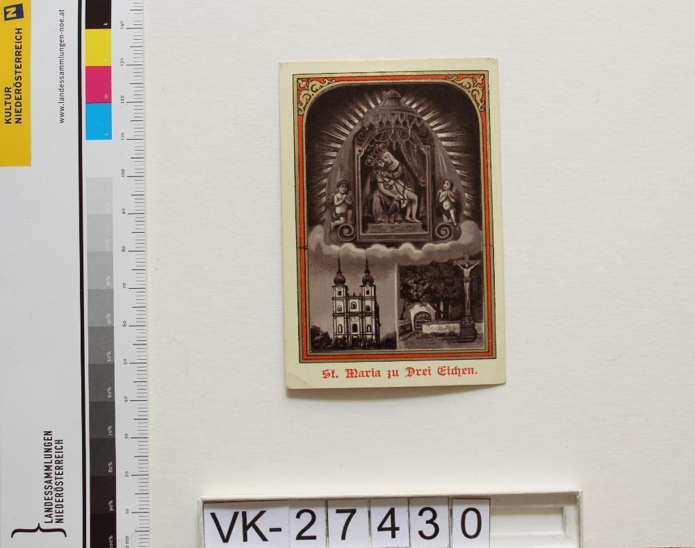 Maria Dreieichen; Vorderseite: Gnadenstatue = Pietà, Basilika, Wallfahrtskapelle, "St. Maria zu Drei Eichen"; Rückseite: "Gebet zur Schmerzhaften Mutter-Gottes", "Verlag v. F.J. Schadek Wien"; falsche Inventarnummer am Objekt