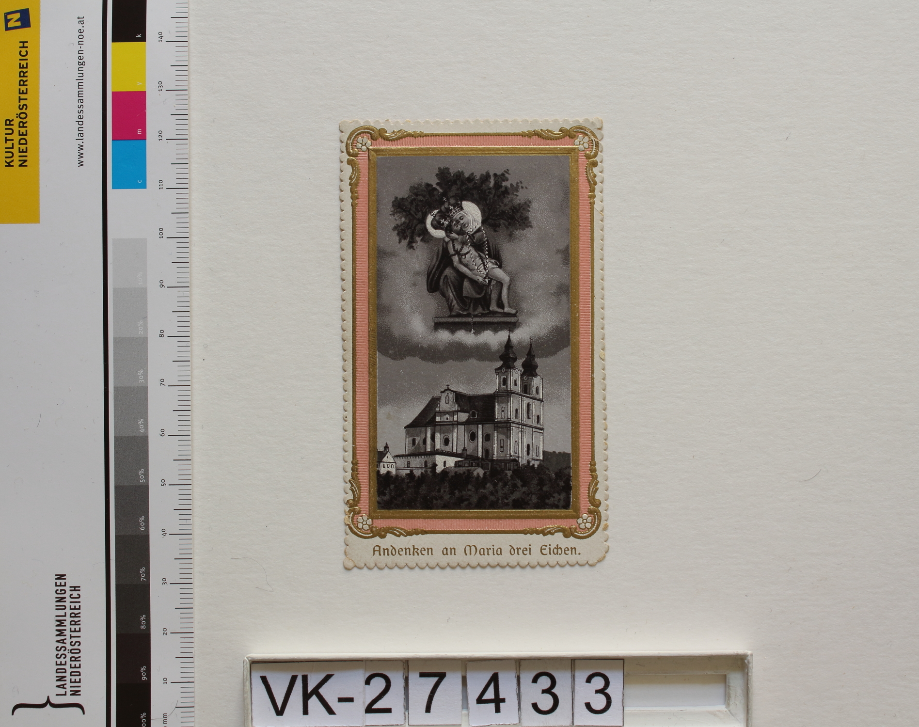 Maria Dreieichen; Vorderseite: Gnadenstatue = Pietà, Basilika, "Andenken an Maria drei Eichen"; Rückseite: "Gebet des heiligen Germanus", "Verlag F.J. Schadek Wien"; falsche Inventarnummer am Objekt
