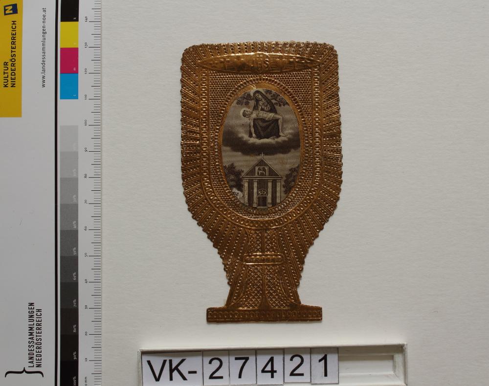 Klein Maria Dreieichen, "Schmerzhafte Muttergottes"; Vorderseite: Gnadenstatue = Pietà, Wallfahrtskapelle; Rückseite: Gebet "Gnadenreiche Mutter Jesu" , "Andenken an St. Maria Klein Dreieichen", "Verlag von Franz Schemm Nürnberg"; Bildchen in Form eines Kelches (Messkelch)