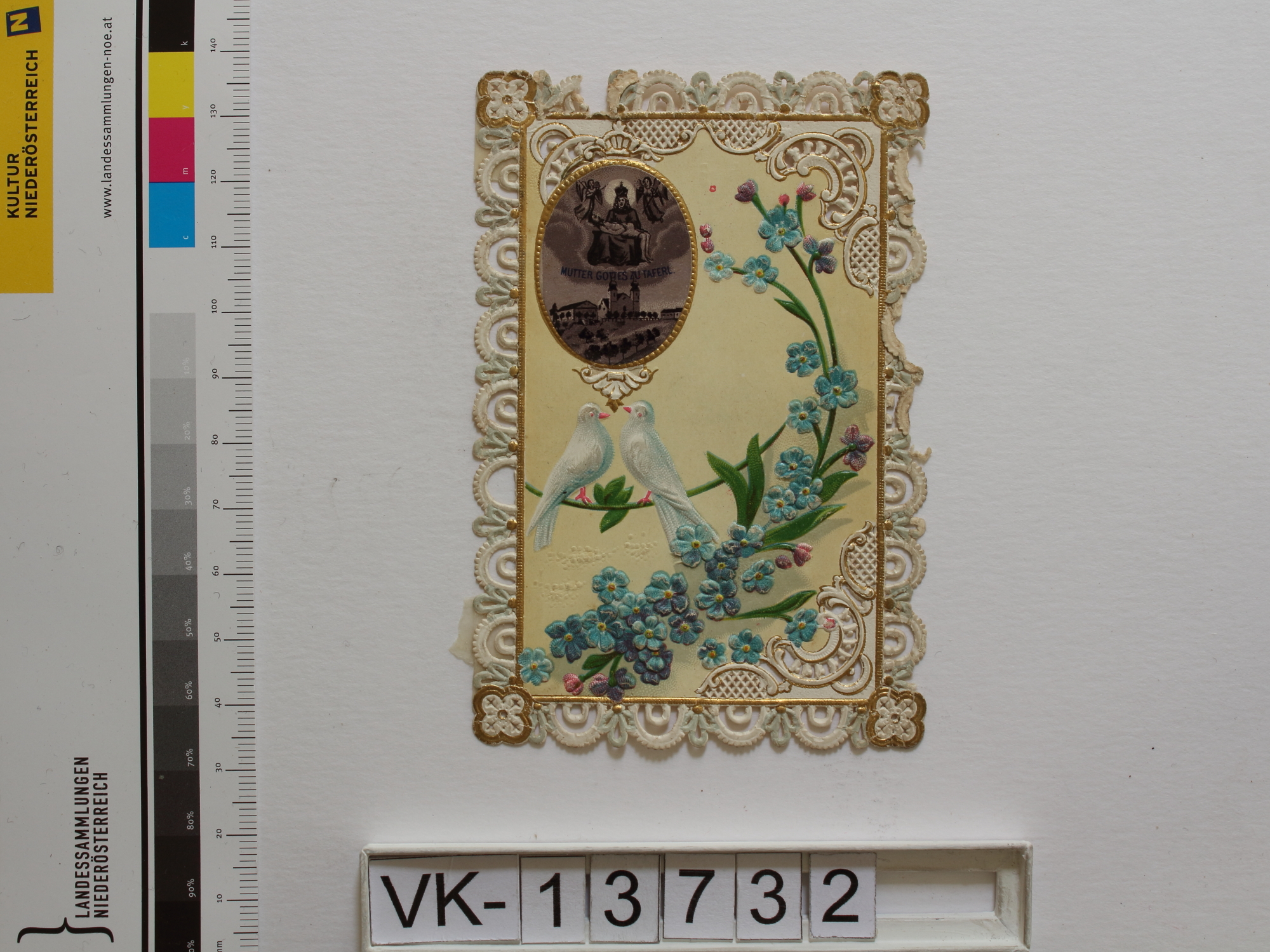 Maria Taferl; Vorderseite: Gnadenstatue = Pietà, Basilika, Blumen (Vergissmeinnicht), Tauben (Friedenstaube); Rückseite: Gebet, monogrammiert "FW"