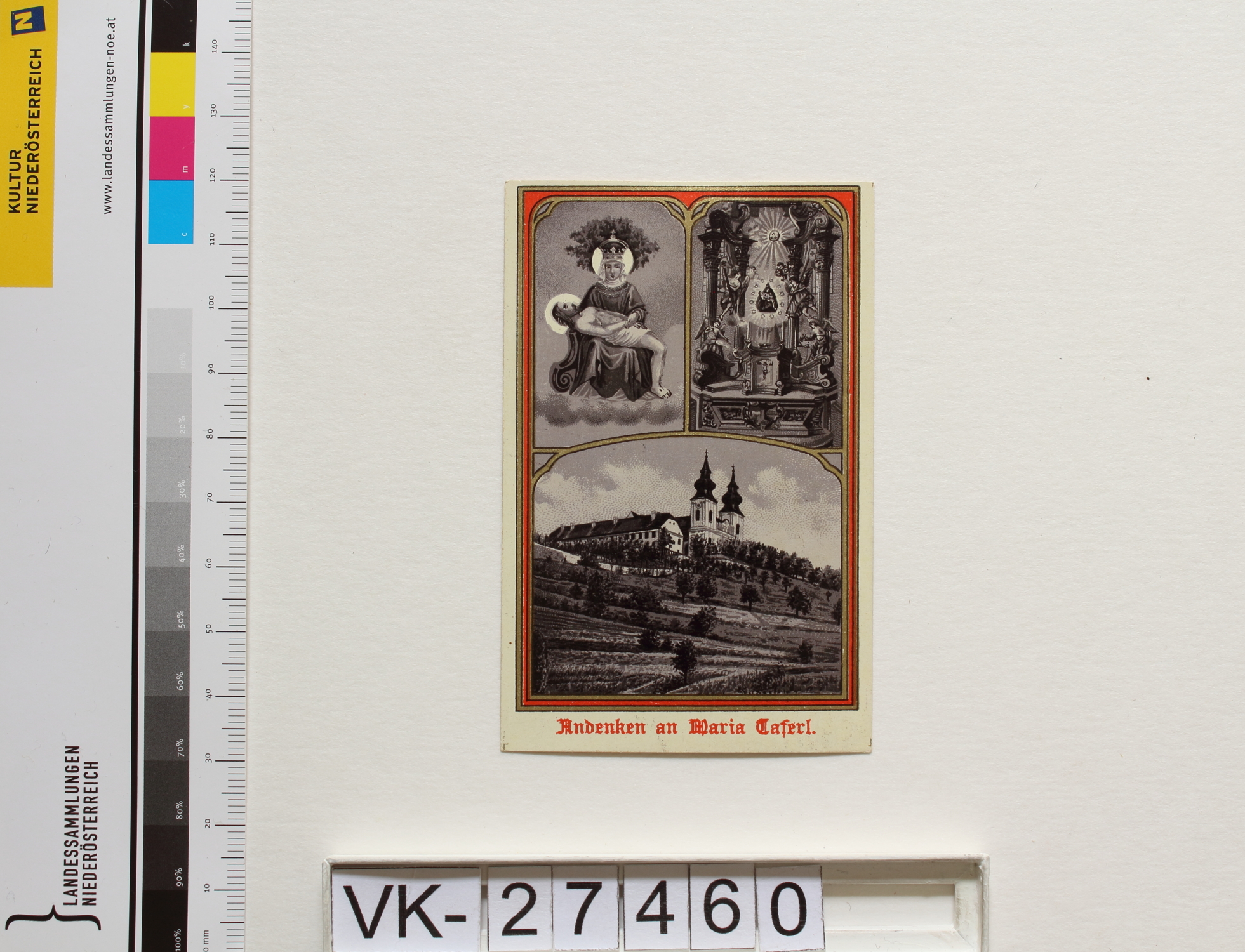 Maria Taferl; Vorderseite: Gnadenstatue = Pietà, Basilika, Altar, "Andenken an Maria Taferl"; Rückseite: "Gebet der schmerzhaften Mutter Gottes", "Gebet der Kirche", "Verlag v. F. J. Schadek Wien"