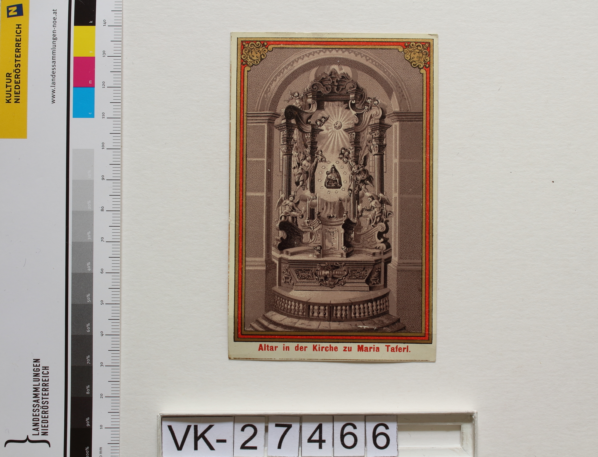 Maria Taferl; Vorderseite: Gnadenstatue = Pietà, Altar, Engel, "Altar in der Kirche zu Maria Taferl"; Rückseite: Gebet "Tägliche Empfehlung in den Schutz Mariens", "Verlag von G. Fischer in Innsbruck"