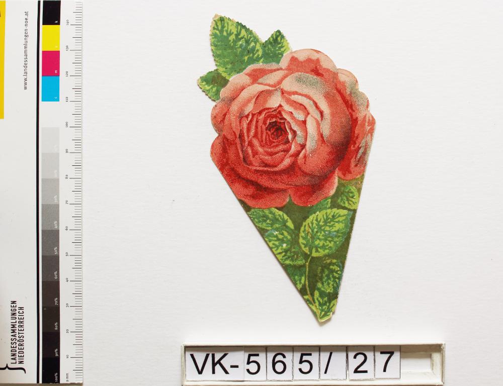 Mariazell; gefaltet; Vorderseite und Rückenseite: Blumen (Rose); Innenseiten: Gnadenstatue = Maria mit Kind, bekleidet, bekrönt; Basilika, Gebet "Gnadenreiche Maria", "Rose von Maria Zell", handschriftlich "42"; Eintrag im Inventarbuch: "9 Stk. davon im Wallfahrtsmuseum Kleinmariazell III12-588/22m-74, Galler 3.5.1974"; Bildchen in Form einer Rose mit Blatt