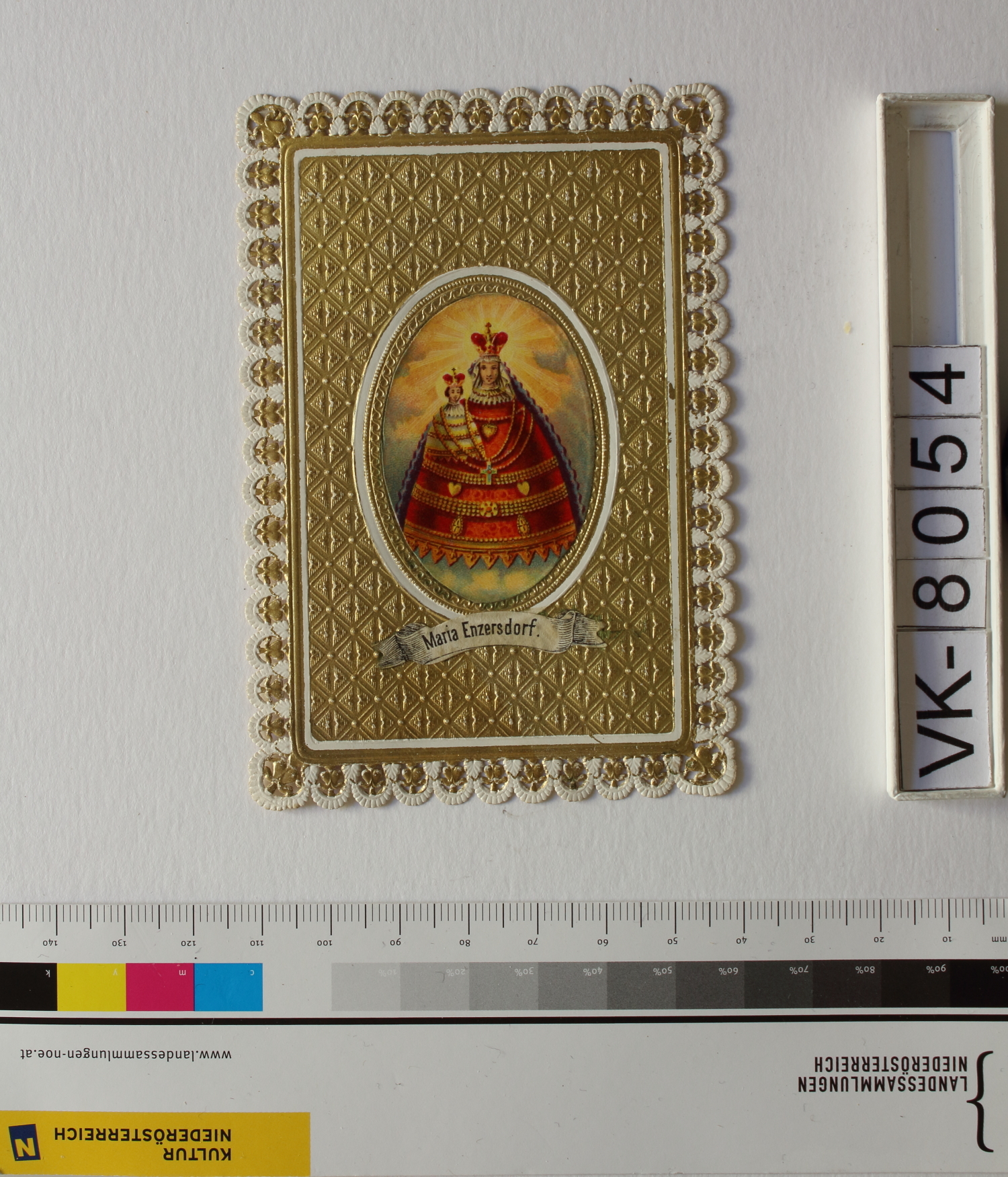 Maria Enzersdorf, "Maria Heil der Kranken"; Vorderseite: Gnadenstatue = Maria mit Kind, "Maria Enzersdorf"; Eintrag Inventarbuch: "Andachtsbildchen, Slg. Klar."