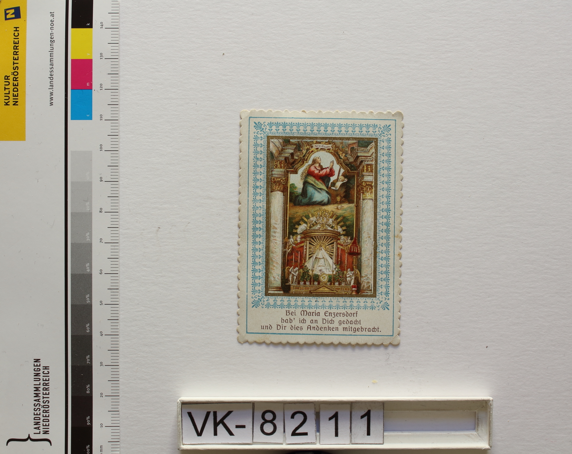 Maria Enzersdorf, "Maria Heil der Kranken"; Vorderseite: Gnadenstatue = Maria mit Kind, Maria Magdalena (Büßerin), Gnadenaltar, Engel, "Bei Maria Enzersdorf hab ich an dich gedacht und dir dies Andenken mitgebracht; Rückseite: "Gebet des hl. Johannes Damascenus", "Verlag F. J. Schadek Wien"; Eintrag Inventarbuch: "Gebetszettel, Slg. Klar."