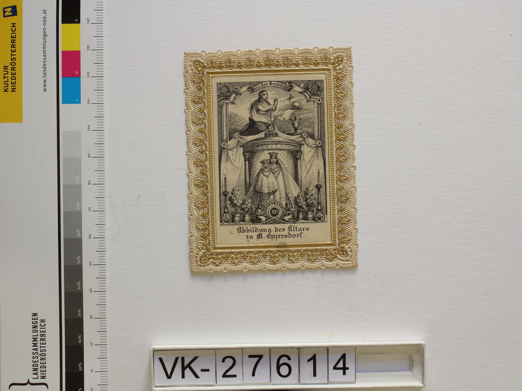 Maria Enzersdorf, "Maria Heil der Kranken"; Vorderseite: Gnadenstatue = Maria mit Kind, Maria Magdalena, (Büßerin), Gnadenaltar, Engel, "Heil der Kranken", "Abbildung des Altars zu M. Enzersdorf"; Rückseite: Gebet "Gnadenreiche Mutter Jesu", "Zum frommen Andenken", "Bei A. Schaufele Stuttgart"