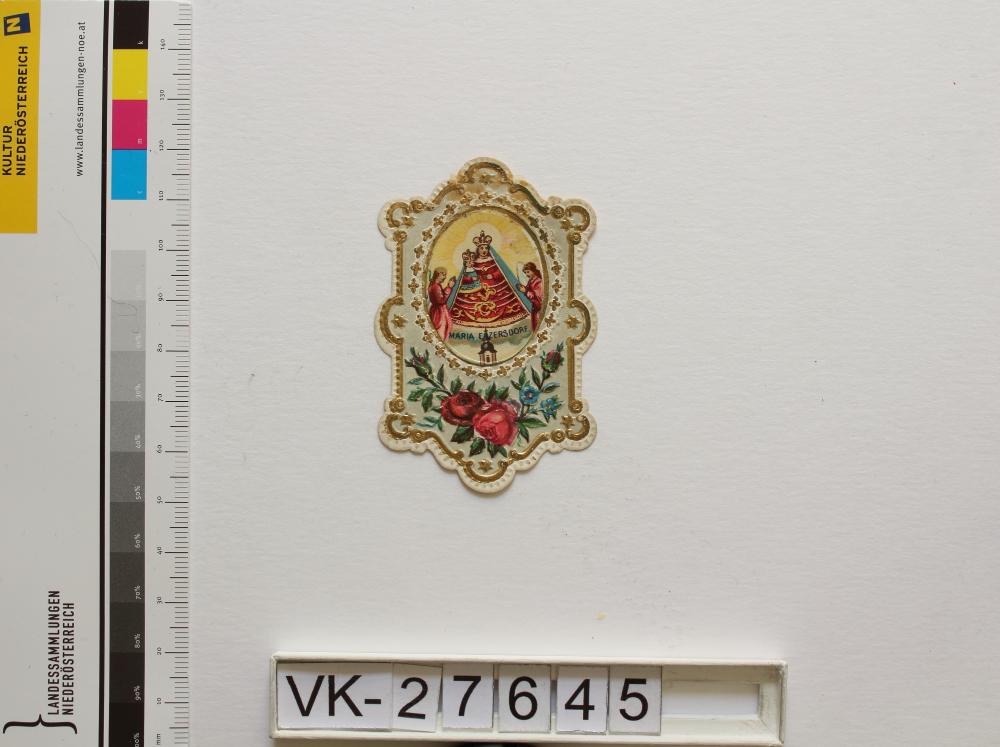 Maria Enzersdorf, "Maria Heil der Kranken"; Vorderseite: Gnadenstatue = Maria mit Kind, Wallfahrtskirche (Turmspitze), Blumen (Rosen, Vergissmeinnicht), Engel, "Maria Enzersdorf"; Rückseite: Gebet