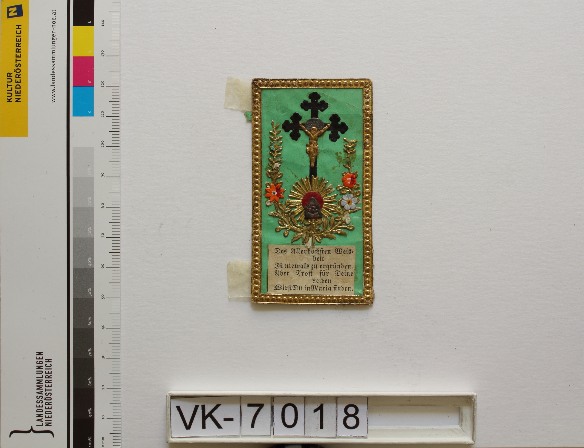 Maria Lanzendorf, "Sieben Schmerzen Mariens"; Vorderseite: Gnadenstatue = Pietà, Kruzifix, Blumen, "Des Allerhöchsten Weisheit ist niemals zu ergründen. Aber Trost für deine Leiden wirst du in Maria finden"; Rückseite: handschriftlich "Lanzendorf", monogrammiert "FW"; Eintrag Inventarbuch: "Andachtsbild (Maria Lanzendorf) im Vorderteil gedruckter Spruch, zusammengesetzt aus Applikationen"