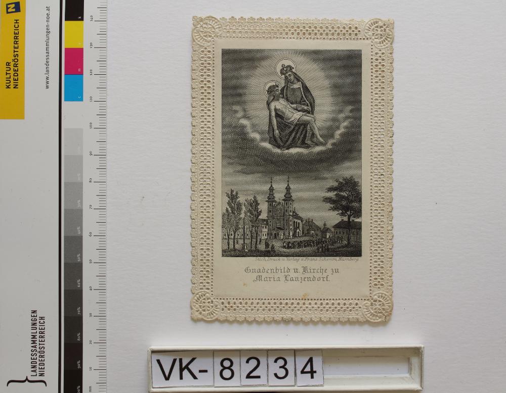 Maria Lanzendorf, "Sieben Schmerzen Mariens"; Vorderseite: Gnadenstatue = Pietà, Wallfahrtskirche, "Gnadenbild u. Kirche zu Maria Lanzendorf", "Stich, Druck, Verlag v. Franz Schemm Nürnberg"; Rückseite: "Gebet"; Eintrag Inventarbuch: "Gebetszettel, Gnadenbild und Kirche, Slg. Klar."