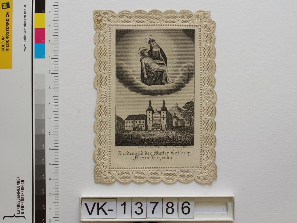 Maria Lanzendorf, "Sieben Schmerzen Mariens"; Vorderseite: Gnadenstatue = Pietà, Wallfahrtskirche, "Gnadenbild der Mutter Gottes zu Maria Lanzendorf", "Stich, Druck u. Verlag v. Franz Schemm Nürnberg"; Rückseite: "Gebet zur Mutter Gottes", "Franz Schemm Nürnberg"
