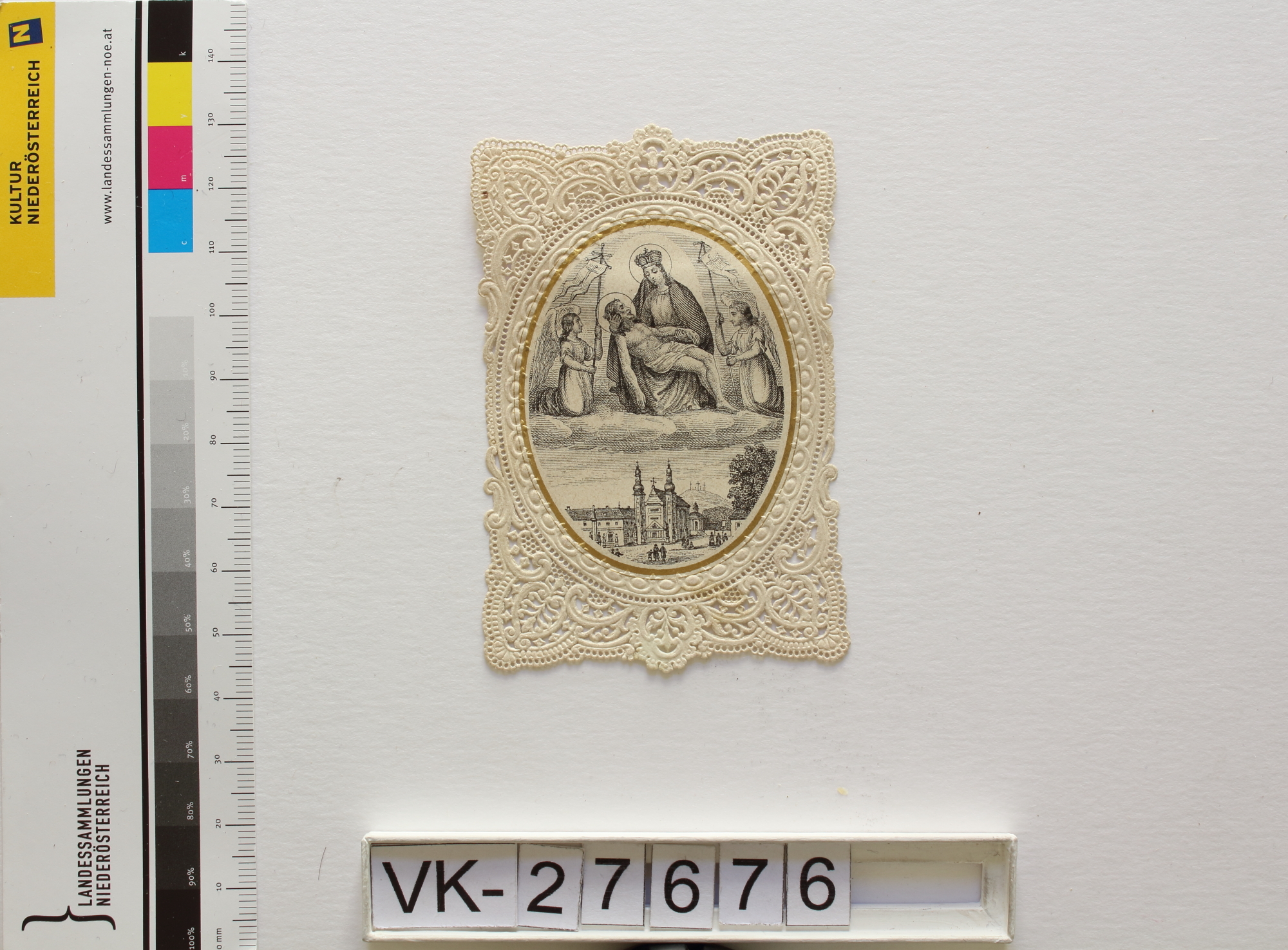 Maria Lanzendorf, "Sieben Schmerzen Mariens"; Vorderseite: Gnadenstatue = Pietà, Wallfahrtskirche, Engel; Rückseite: "Gebet Maria Lanzendorf", "Schaufele und Schepperlen Stuttgart"