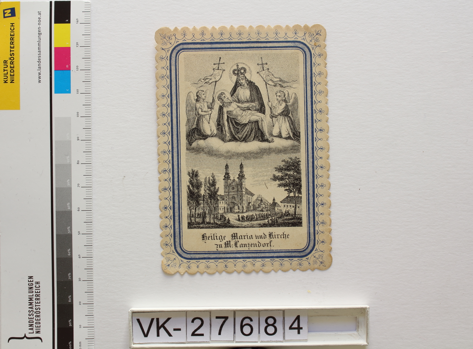 Maria Lanzendorf, "Sieben Schmerzen Mariens"; Vorderseite: Gnadenstatue = Pietà, Wallfahrtskirche, Engel, "Heilige Maria und Kirche zu M. Lanzendorf"; Rückseite: Gründungsgeschichte "Ursprung des Gnadenortes Maria Lanzendorf", "Bei A. Schaufele Stuttgart"