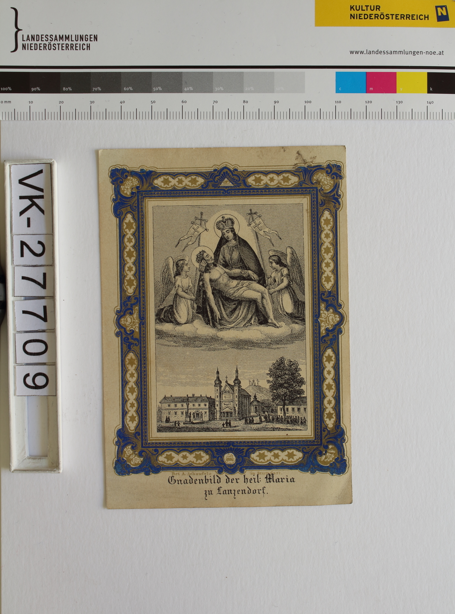 Maria Lanzendorf, "Sieben Schmerzen Mariens"; Vorderseite: Gnadenstatue = Pietà, Wallfahrtskirche, Engel, "Gnadenbild der heil: Maria zu Lanzendorf", "Bei A. Schaufele Stuttgart"