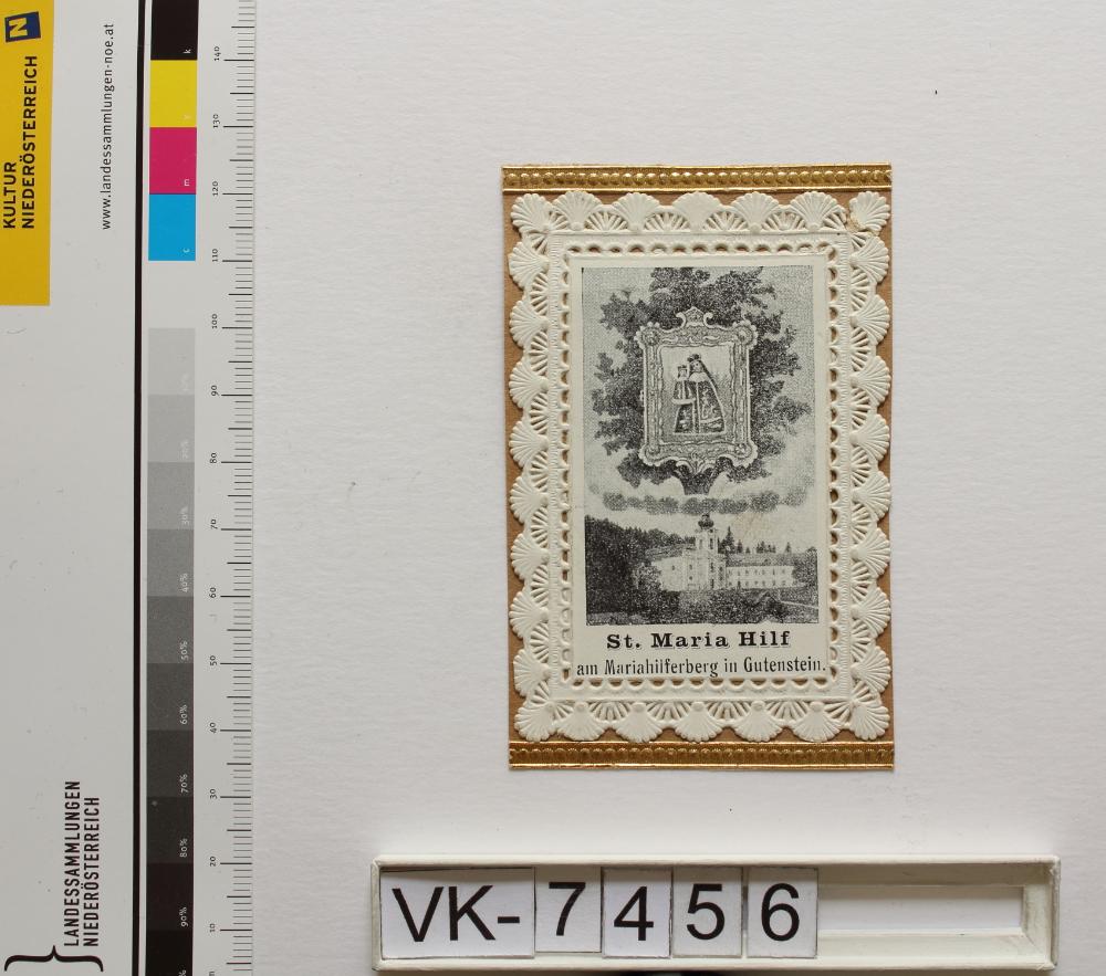 Mariahilfberg bei Gutenstein; Vorderseite: Gnadenbild = Maria mit Kind, Wallfahrtskirche, "St. Maria Hilf am Mariahilferberg in Gutenstein"; Rückseite: Gebet; verklebt auf Karton; Eintrag Inventarbuch: Wallfahrtsbild, Slg. Klar
