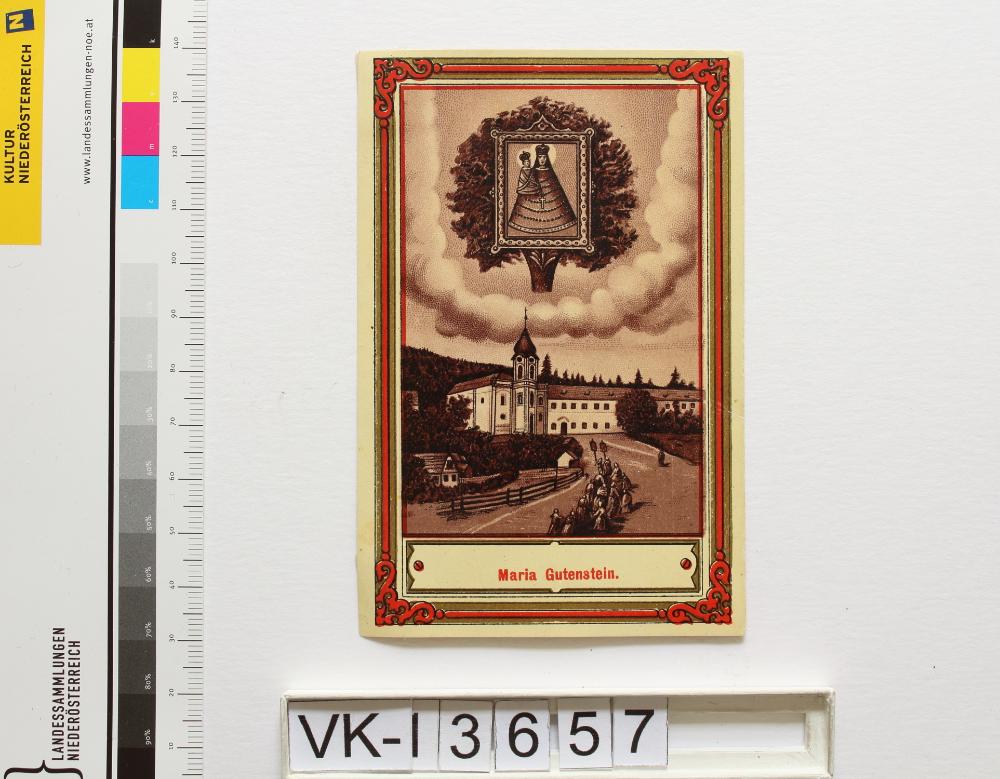 Mariahilfberg bei Gutenstein; Vorderseite: Gnadenbild = Maria mit Kind, Wallfahrtskirche, "Maria Gutenstein"; Rückseite: "Gebet zur heil. Mutter Gottes", "J. L. Bayer Kolin", monogrammiert "FW"