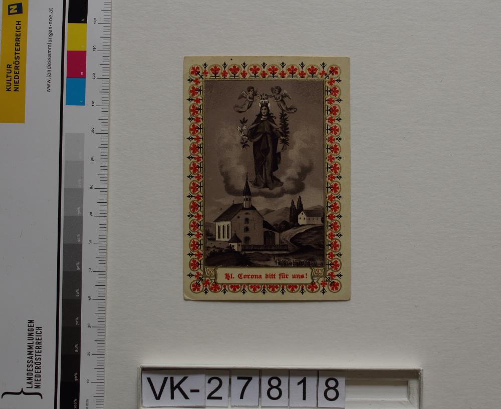 Sankt Corona am Wechsel; Vorderseite: Gnadenbild = Hl. Corona als Gekrönte (mit Krone, Palmzweig, Lilie), Engel, Wallfahrtskirche, "Hl. Corona bitt für uns"; Rückseite: "Gebet zur heiligen Korona", "Verlag von Gregor Fischer Innsbruck"