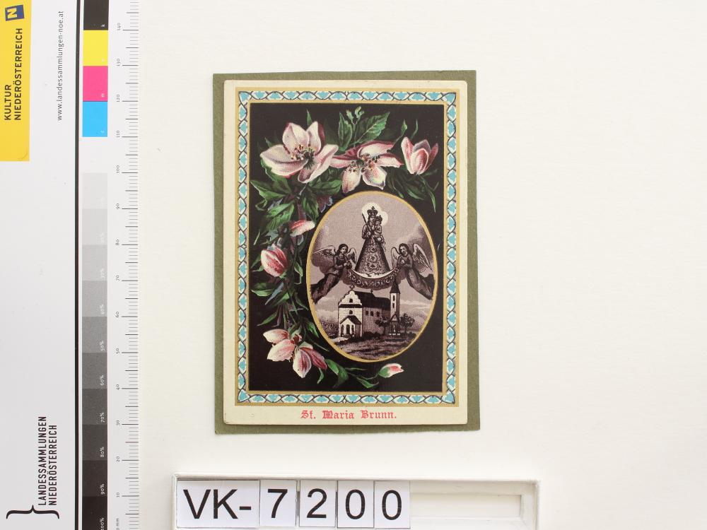 Mariabrunn in Wien-Penzing; Vorderseite: Gnadenstatue = Maria mit Kind, Wallfahrtskirche, Engel, Blumen (Hibiskus?), "St. Maria Brunn"; Rückseite: "Gebet zur hl. Jungfrau Maria", "Verlag F. J. Schadek Wien"; verklebt auf Karton; Eintrag Inventarbuch: Chromlithografie, Slg. Klar.