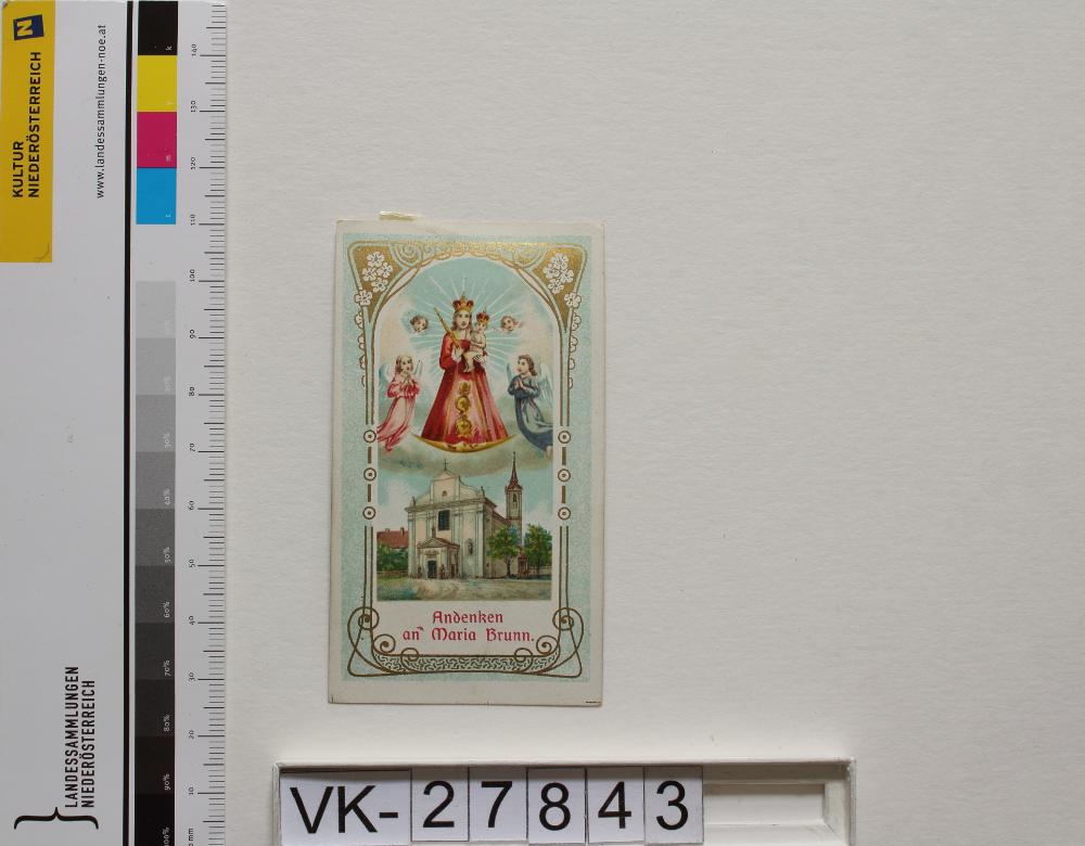 Mariabrunn in Wien-Penzing; Vorderseite: Gnadenstatue = Maria mit Kind, Wallfahrtskirche, Engel, Engelsköpfe, "Andenken an Maria Brunn"; Rückseite: Gebet, "Verlag von Gregor Fischer Innsbruck"