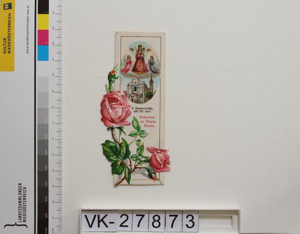 Mariabrunn in Wien-Penzing; Vorderseite: Gnadenstatue = Maria mit Kind, Wallfahrtskirche, Engel, Engelsköpfe, Blumen (Rosen), "Andenken an Maria Brunn", "O Gnadenreiche, bitt für uns"; Rückseite: "Gebet zur Jungfrau Maria", "F. J. Schadek´s Www. Wien"