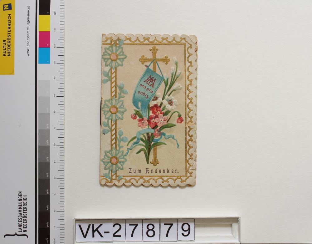 Mariabrunn in Wien-Penzing; 2 Blatt, gefaltet, geheftet; Vorderseite: Kreuz, Fahne mit Monogramm Mariens "ora pro nobis", Blumen (Lilien, Primel, Phantasieblume), "Zum Andenken"; Innenseiten: Gnadenstatue = Maria mit Kind, Wallfahrtskirche, Engel Engelsköpfe, "Andenken an Maria Brunn", "Gebet zur glorreichen Jungfrau Maria"; Rückseite: Gebet, Blumen (Phantasieblume)
