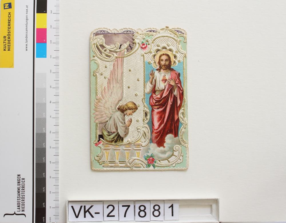 Mariabrunn in Wien-Penzing; aufklappbar; Vorderseite: Jesus (Herz Jesu), Engel, Blumen, Kreuz, (Rosen, Vergissmeinnicht); Innenseiten: Gnadenstatue = Maria mit Kind, Wallfahrtskirche, Engel Engelsköpfe, Gebet; Rückseite: Gebet "Gruß an Maria"