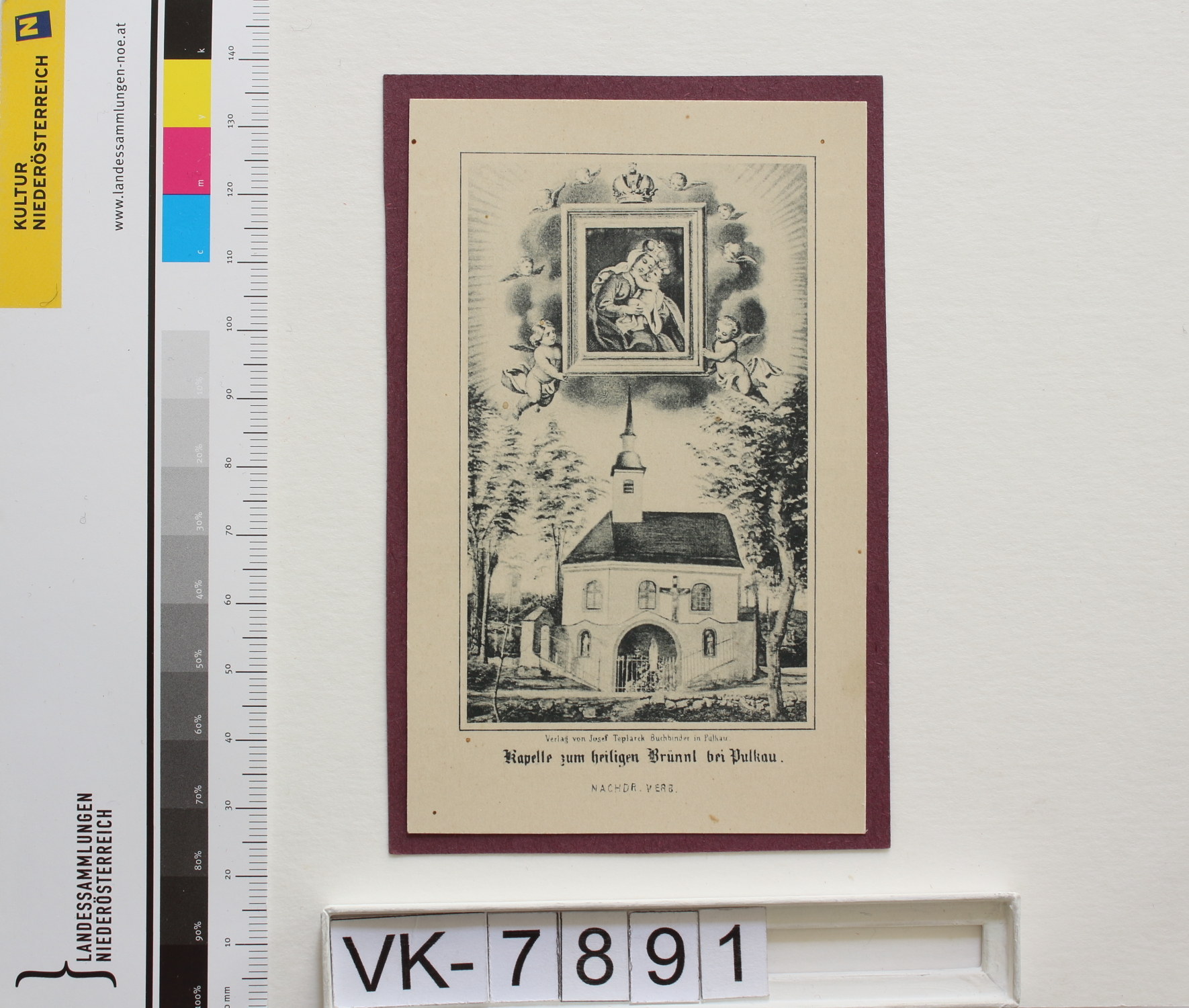 Pulkau, "Pulkauer Bründl"; Vorderseite: Gnadenbild = Maria mit Kind, Wallfahrtskapelle = Maria Bründl Kapelle mit Lourdesgrotte, Engel, Engelsköpfe, "Kapelle zum heiligen Brünnl bei Pulkau", "Verlag von Josef Teplarek, Buchbinder in Pulkau"; Rückseite: Gründungsgeschichte (unvollständig 2. Seite fehlt); Eintrag Inventarbuch: Gebetszettel, Slg. Klar.